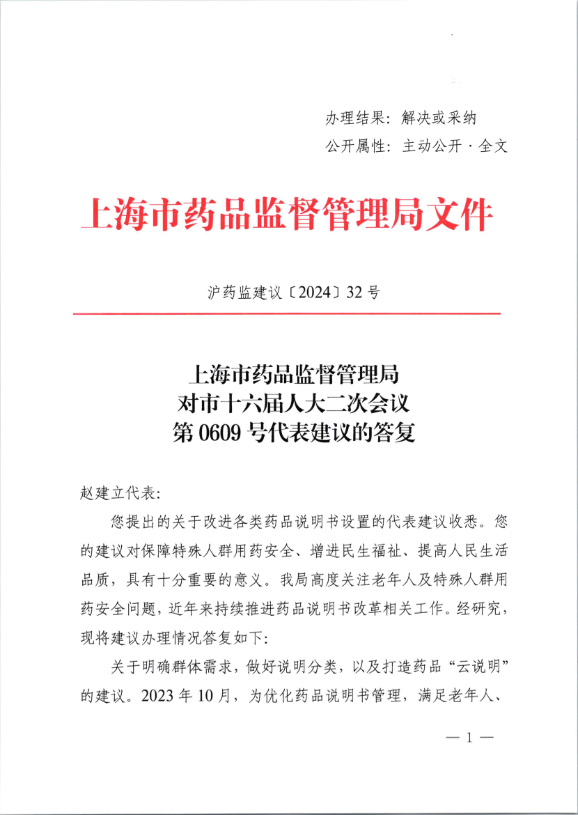 关于明确群体需求,做好说明分类,以及打造药品“云说明”的建议。2023年10月,为优化药品说明书管理,满足老年人、残疾人用药需求,解决药品说明书“看不清”等问题,国家药品监管局制定并发布《药品说明书适老化及无障碍改革试点工作方案》(以下简称《工作方案》),确定在上海、江苏、浙江等八个省份开展老年患者常用的部分口服、外用药品制剂药品说明书适老化及无障碍改革试点。试点方式包括在药品包装内提供纸质药品说明书(大字版),或者提供纸质药品说明书(完整版)和电子药品说明书(完整版),或者提供纸质药品说明书(简化版)和电子药品说明书(完整版)等三种方式供药品上市许可持有人选择,并鼓励持有人提供药品说明书、标签的语音播报服务、盲文信息,满足老年人、盲人和其他有视力障碍患者的安全用药需求。据统计,截至2024年5月6日,国家药品监管局已公示759个试点品种名单,其中270个品种完成药品说明书的备案工作,多个品种已使用新的药品说明书投入市场,群众反映良好。