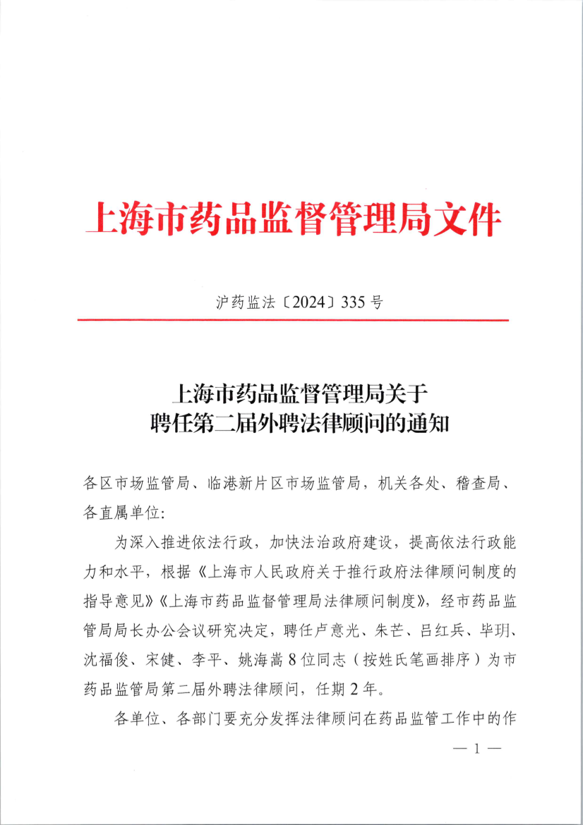 为深入推进依法行政,加快法治政府建设,提高依法行政能力和水平,根据《上海市人民政府关于推行政府法律顾问制度的指导意见》《AG真人法律顾问制度》,经市药品监管局局长办公会议研究决定,聘任卢意光、朱芒、吕红兵、毕玥、沈福俊、宋健、李平、姚海嵩8位同志(按姓氏笔画排序)为市药品监管局第二届外聘法律顾问,任期2年。