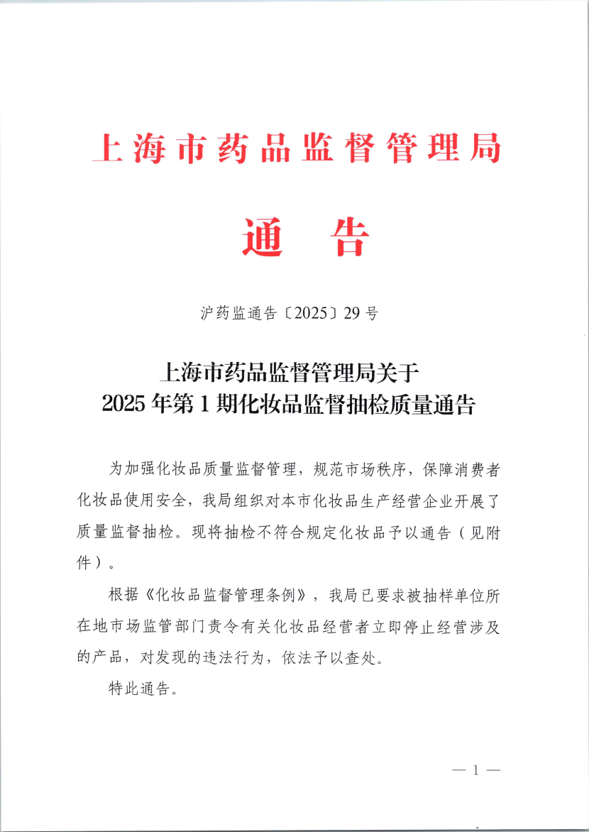 AG真人关于2025年第1期化妆品监督抽检质量通告