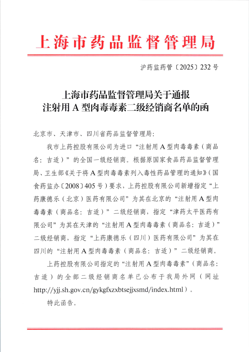 上药控股有限公司指定的“注射用A型肉毒毒素”(商品名:吉适)的全部二级经销商名单已公布于我局外网(网址http://m.xime.cc/gykgfxzxbtsejjxsmd/index.html)。